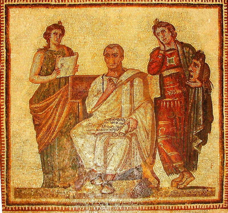 PUBLIUS VERGILIUS MARO (5) - egy Kr. u. III. századi tunéziai mozaikon. Vergilius két oldalán a két Múzsa: Kalliopé (az eposz) és Melpomené (a komoly költészet) istennője.