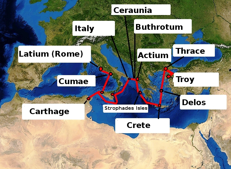 És most következzenek az Aeneas-ábrázolások! Ez itt az Égeikum (Aegeicum) egy modern műholdal felvételen. Benne az Aeneas által megtett út állomásai vannak jelölve s a nevük kinagyítva.